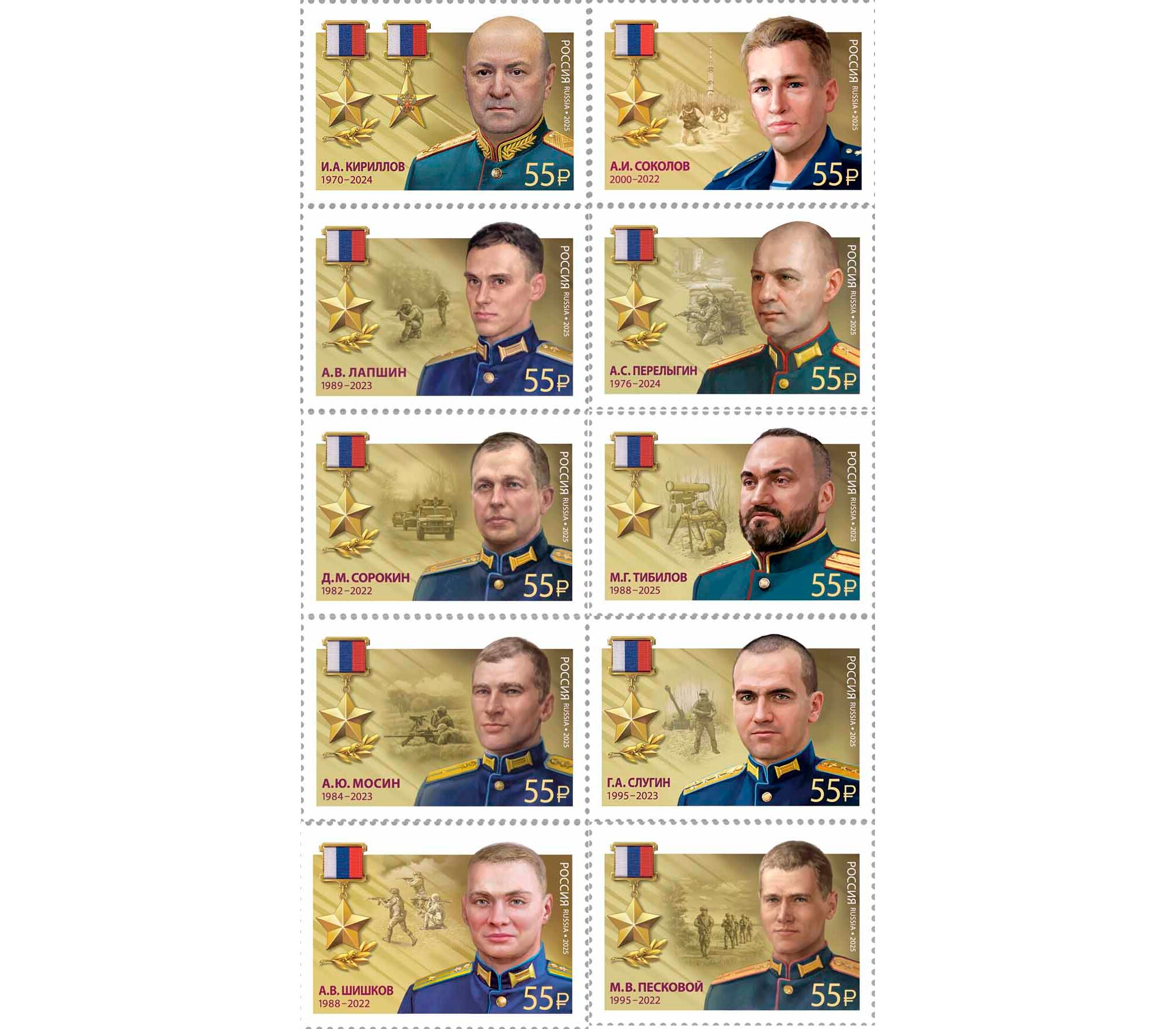 10 марок «Герои Российской Федерации. И.А. Кириллов, А.В. Лапшин, А.Ю. Мосин, М.В. Песковой, А.С. Перелыгин, Г.А. Слугин, А.И. Соколов, Д.М. Сорокин, М.Г. Тибилов, А.В. Шишков» 2025