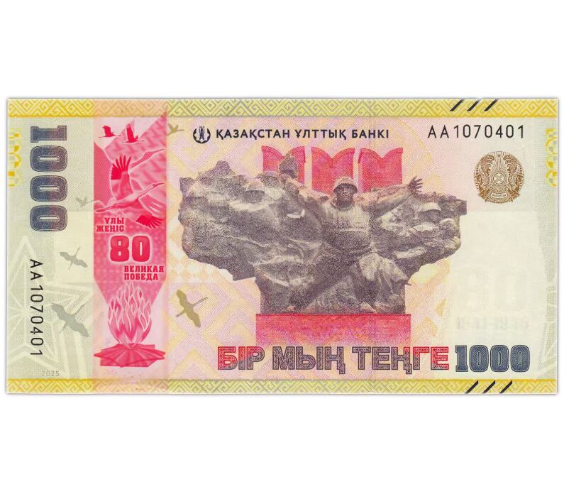 В 2025 году Национальный банк Казахстана выпустил уникальную памятную банкноту номиналом 1000 тенге, посвящённую 80-летию Победы в Великой Отечественной войне (1941–1945 гг.). Этот выпуск стал знаковым событием, символизирующим глубокое уважение страны к героизму и подвигам ветеранов, а также к исторической памяти поколений.