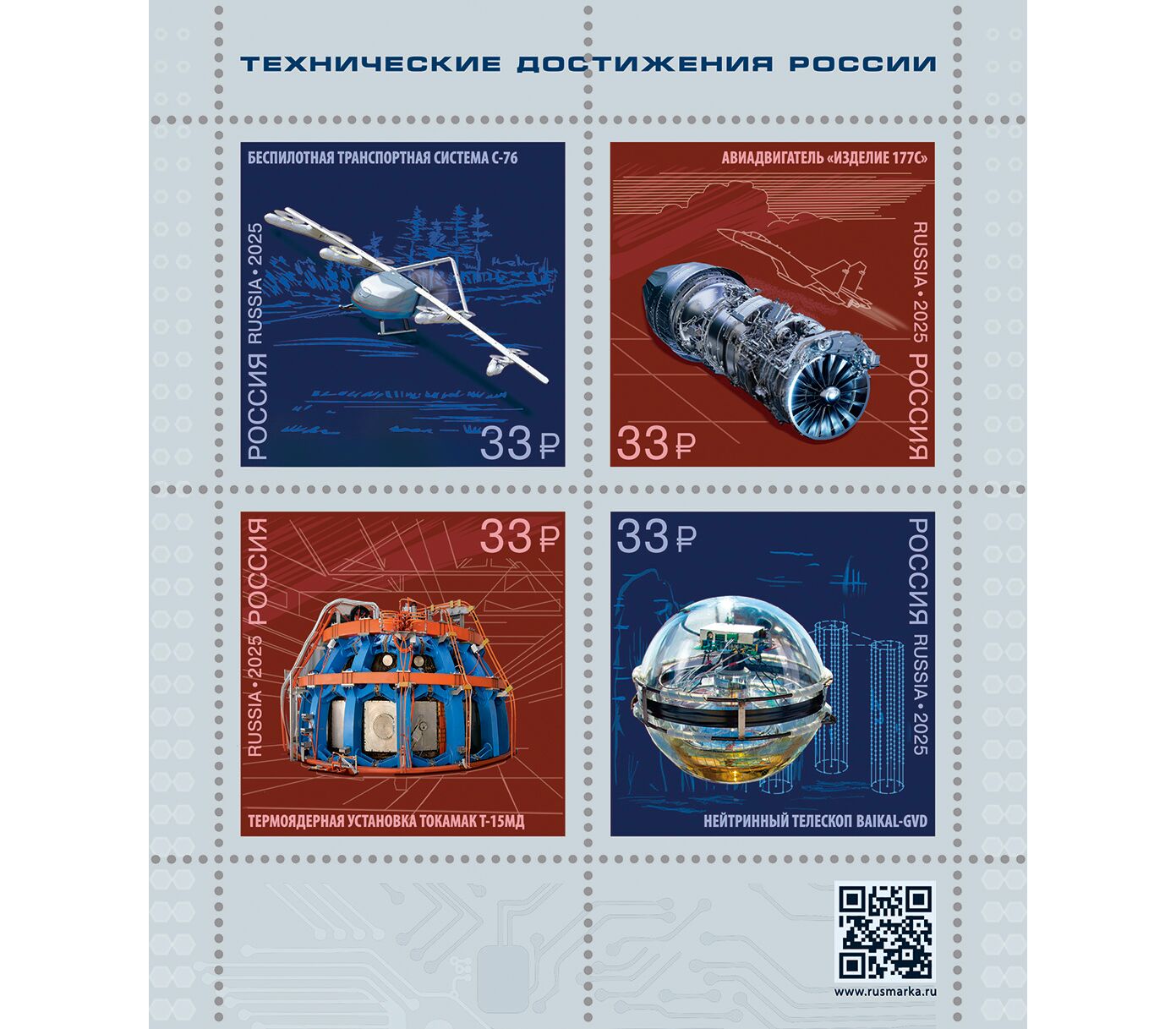 Лист с почтовыми марками, выпущенными в 2025 году и посвященными техническим достижениям России. В лист вошли 4 почтовые марки. Номинал каждой марки — 33 рубля.
