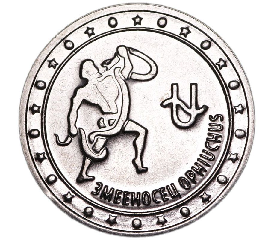 Реверс: в центре — стилизованное изображение знака зодиака «ЗМЕЕНОСЕЦ», в нижней части монеты — по кругу надпись «ЗМЕЕНОСЕЦ OPHIUCHUS».