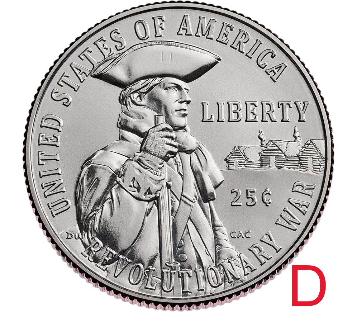 На оборотной стороне изображен солдат Континентальной армии в Вэлли-Фордж, штат Пенсильвания. Войска Вашингтона потерпели поражение в битве при Брэндивайне и столкнулись с болезнями и сильным холодом во время зимнего лагеря в 1777–1778 годах. Независимость была провозглашена в июле предыдущего года, но Второй Континентальный конгресс был вынужден бежать из Филадельфии, чтобы избежать британского нападения. Решительный взгляд солдата показывает его волю преодолеть испытания войны в погоне за свободой.