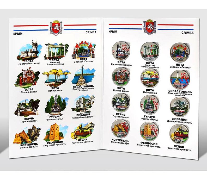 Прекрасный подарок для нумизмата! Цветные монеты с достопримечательностями Крыма в ярком альбоме. Альбом входит в серию «Города России».
